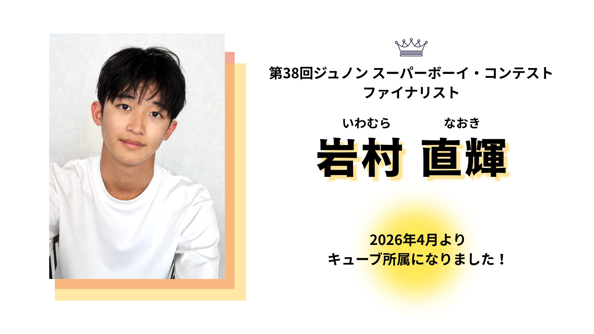 ★岩村 直輝(いわむら なおき) 2011年9月9日生まれ(14歳) 第38回ジュノン・スーパーボーイ・コンテスト(2025年) ファイナリスト https://www.cubeinc.co.jp/archives/artist/iwamuranaoki