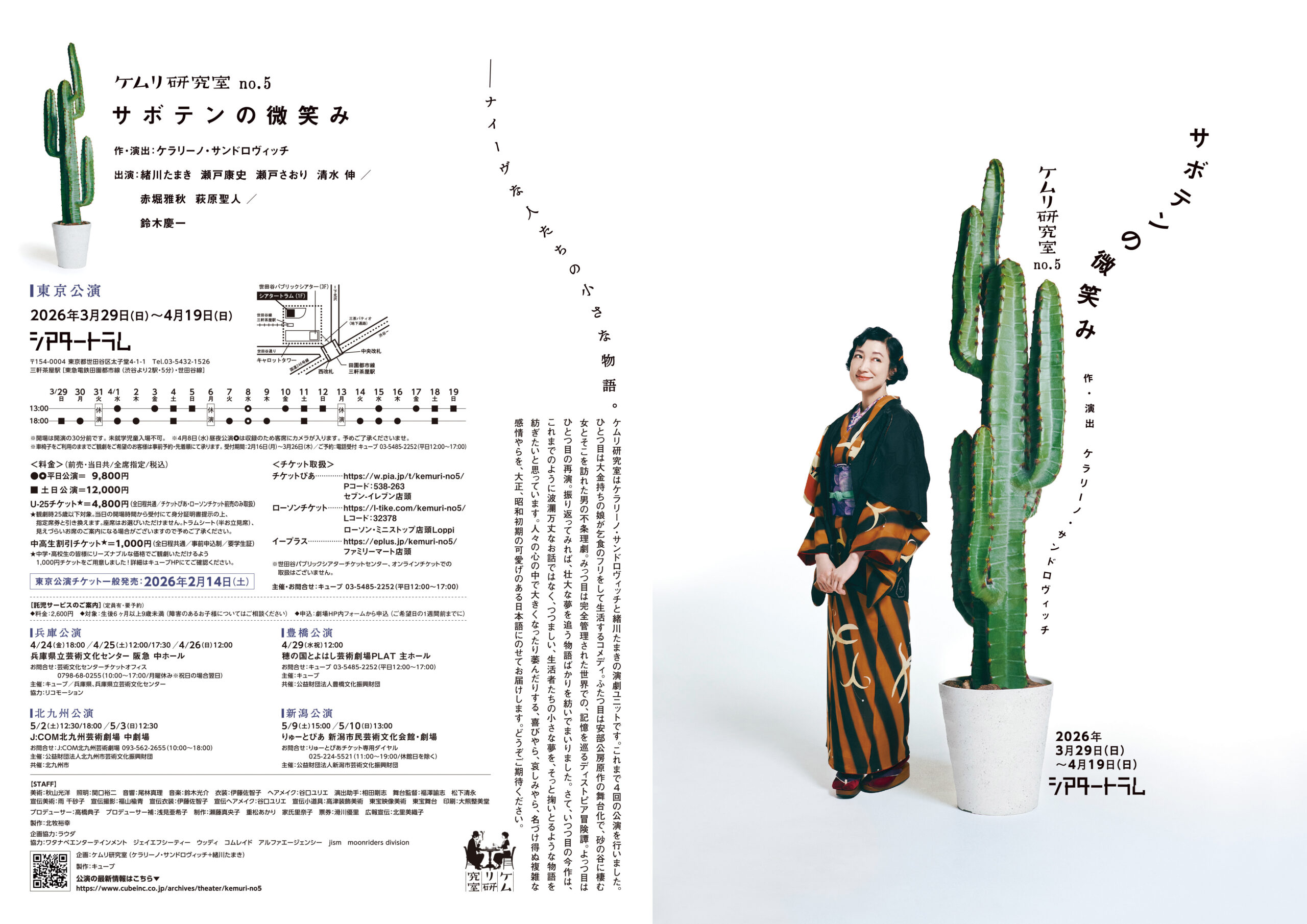 ケムリ研究室はケラリーノ・サンドロヴィッチと緒川たまきの演劇ユニットです。これまで4回の公演を行いました。ひとつ目は大金持ちの娘が乞食のフリをして生活するコメディ。ふたつ目は安部公房原作の舞台化で、砂の谷に棲む女とそこを訪れた男の不条理劇。みっつ目は完全管理された世界での、記憶を巡るディストピア冒険譚。よっつ目はひとつ目の再演。振り返ってみれば、壮大な夢を追う物語ばかりを紡いでまいりました。さて、いつつ目の今作は、これまでのように波瀾万丈なお話ではなく、つつましい、生活者たちの小さな夢を、そっと掬いとるような物語を紡ぎたいと思っています。人々の心の中で大きくなったり萎んだりする、喜びやら、哀しみやら、名づけ得ぬ複雑な感情やらを、大正、昭和初期の可愛げのある日本語にのせてお届けします。どうぞご期待ください。